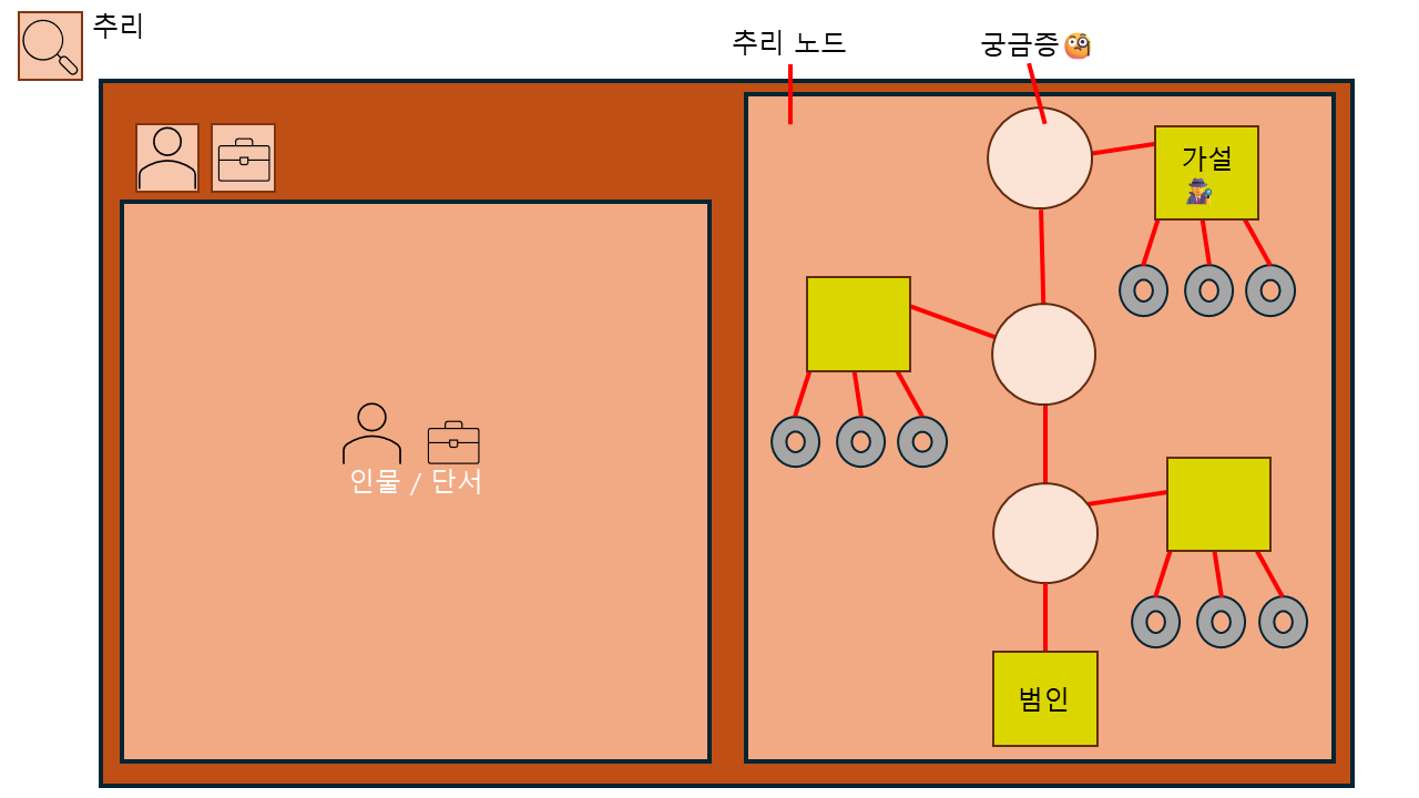 - 우측: 좌측의 단서를 우측의 추리 노드에 끌어와 거는 방식. 먼저 스토리를 진행하며 사건에 대한 의문점이 생기고, 그것을 풀 가설을 선택 후 그것을 뒷받침 할 증거를 고리에 걸은 후 맞으면 다음 스토리 진행.